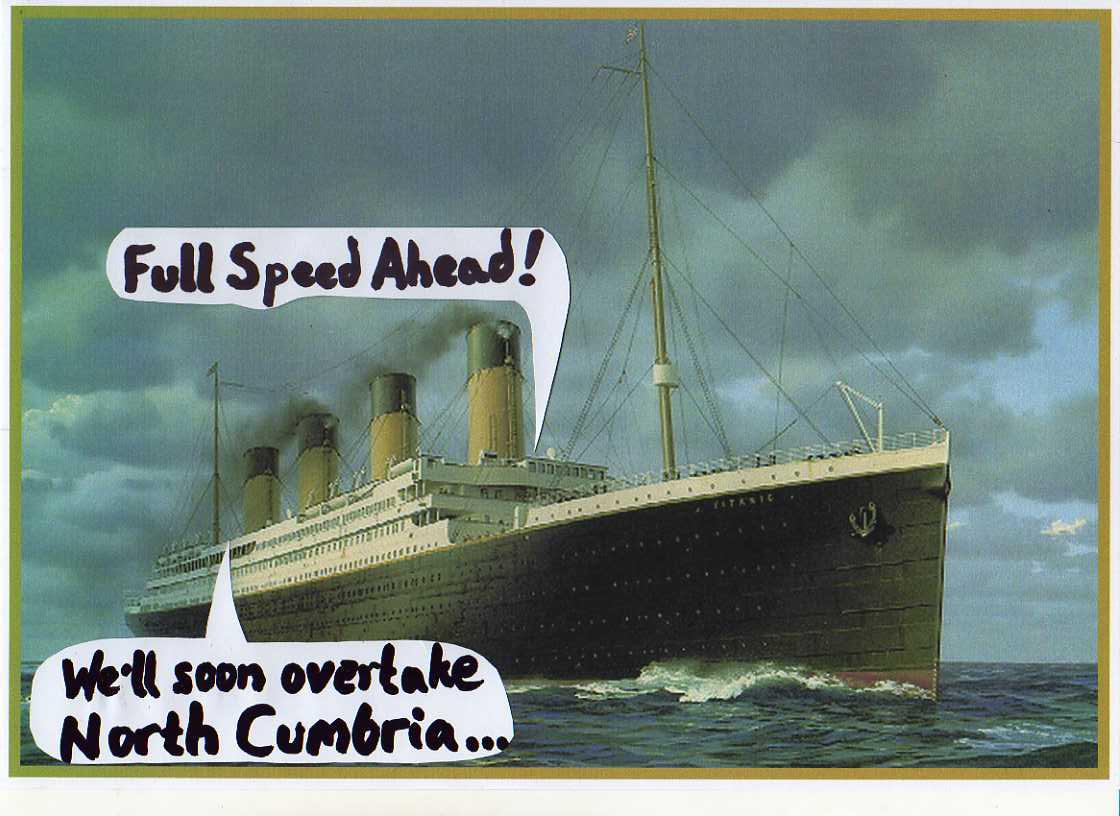 Throughout my captivity, ensnared in a weird web of self-adoration Morecambe Bay had spun & woven for itself, the Trust cruised on sublimely to achieve Foundation Status. Few dared challenge their much-trumpeted success, though even fewer knew quite what that success might actually be. Flattered & fascinated then by their own reflection in the public eye, they gazed outward and dreamed of conquering new empires. They made promising bid to take control of all Cumbria’s Health Services and looked set to deliver their undisputed benevolent influence right across the North-West and next, …the world. Blissfully blind that their renown might rest only upon their own vain assertions, caked in cover-up cosmetics, propaganda perfumed, an unheeding Titanic Trust steamed on, arrogantly contemptuous of whistled warnings, certain & unsinkable …straight into the ice-field.