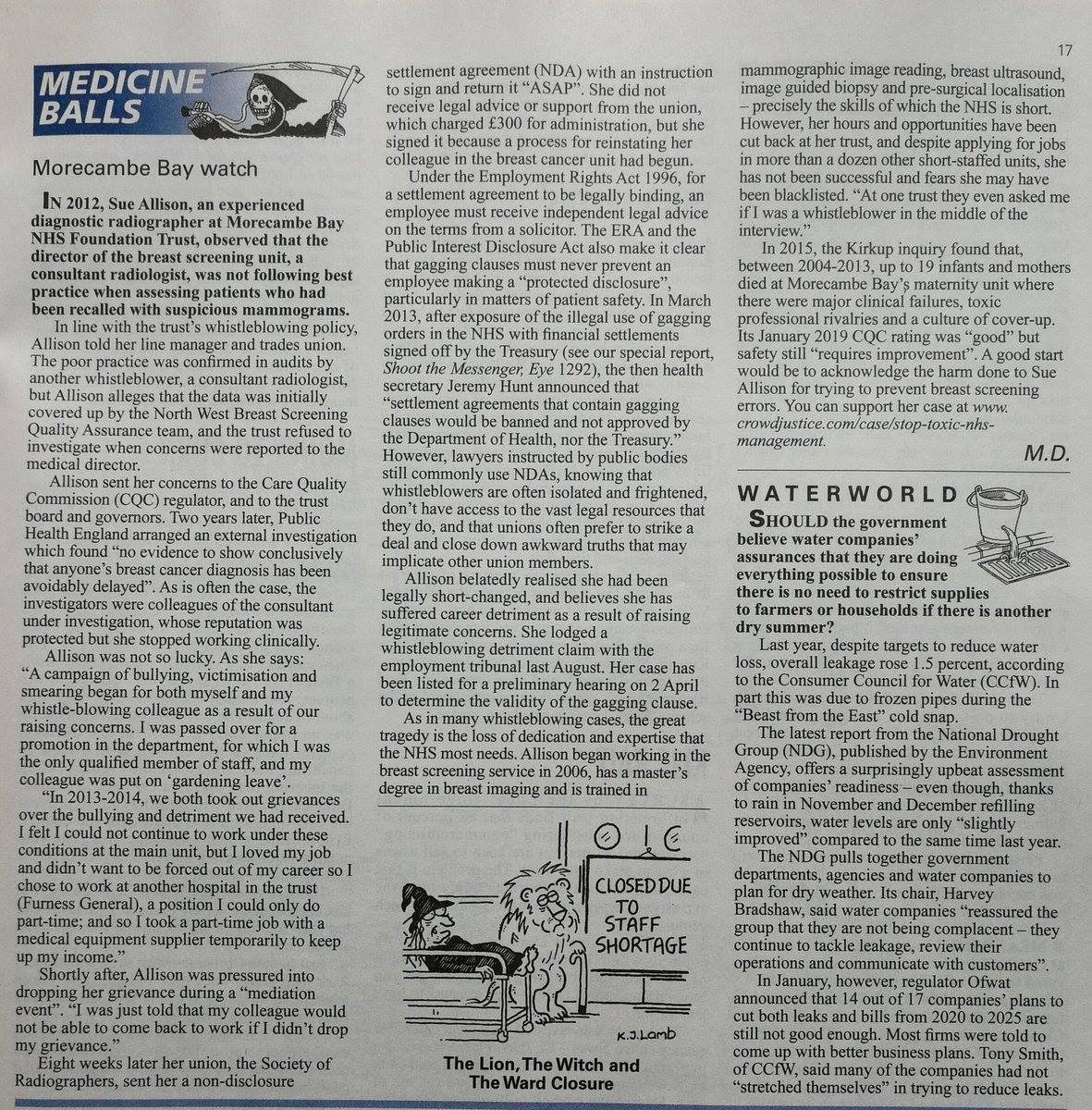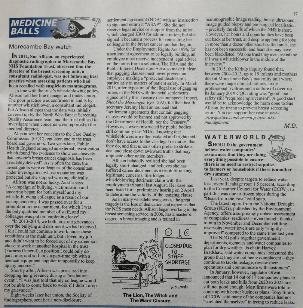 Calling out the Trust’s bluff, now that they have no reputation worth saving, I have “blabbed” to Channel 4 Dispatches, Sunday Times, Lancaster Guardian, Radio 4, Bay Radio, Heart Radio, The Morecambe Bay Investigation, Lancashire Police Major Crimes Unit, Morecambe Bay CEOs Jackie Daniel & Aaron Cummins, NHS England, NHS Improvement, Jobcentre & Citizen’s Advice staff, several barmaids, half a dozen taxi drivers, that bloke on the train, Uncle Tom Cobley, Facebook, Twitter and, yes, there are more to come! That’s just what’s expected of a dirty lowdown whistleblower, isn’t it?